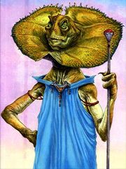 Physical Description: Reptilian humanoids. The average Tarasin stands about 1.6 to 1.7 meters tall. Its body is covered in translucent scales. The skin beneath the scales changes color. When one is frightened or angry, a multicolored "fan" of thin, scaly flesh spreads out around a Tarasin's head.